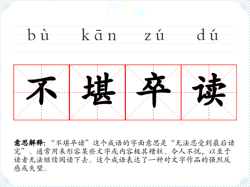 “不堪卒读”这个成语的字面意思是“无法忍受到最后读完”。通常用来形容某些文字或内容极其糟糕、令人不悦,以至于读者无法继续阅读下去。这个成语表达了一种对文字作品的强烈反感或失望。