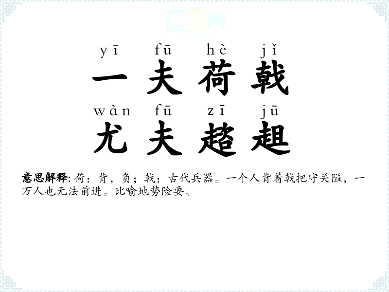 荷:背,负;戟:古代兵器。一个人背着戟把守关隘,一万人也无法前进。比喻地势险要。