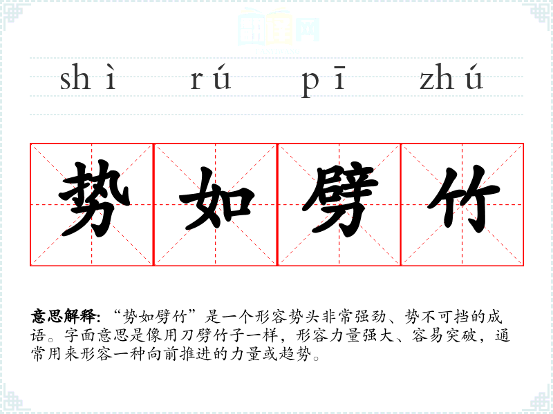 “势如劈竹”是一个形容势头非常强劲、势不可挡的成语。字面意思是像用刀劈竹子一样,形容力量强大、容易突破,通常用来形容一种向前推进的力量或趋势。