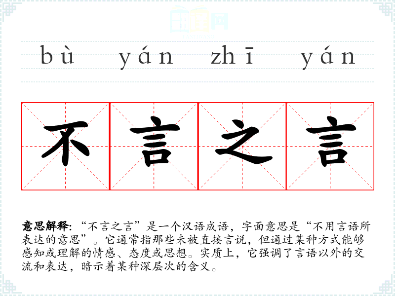 “不言之言”是一个汉语成语,字面意思是“不用言语所表达的意思”。它通常指那些未被直接言说,但通过某种方式能够感知或理解的情感、态度或思想。实质上,它强调了言语以外的交流和表达,暗示着某种深层次的含义。