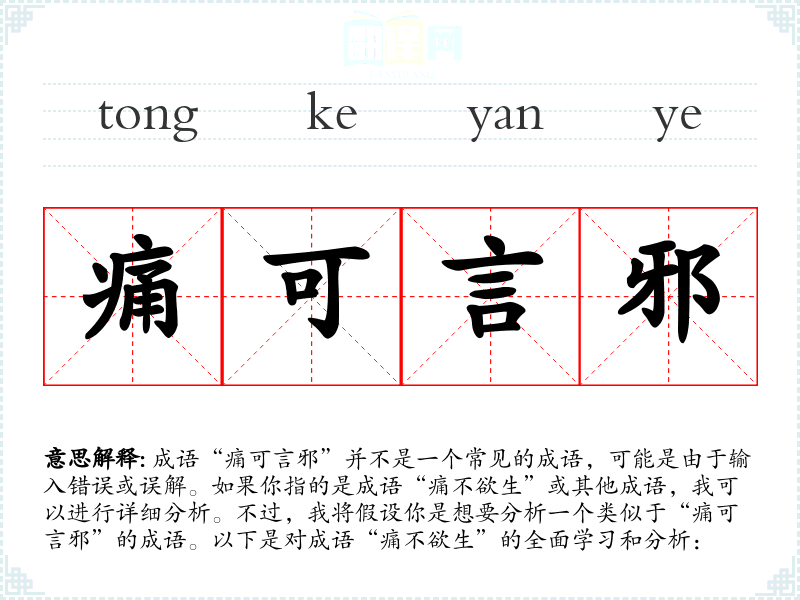 成语“痛可言邪”并不是一个常见的成语,可能是由于输入错误或误解。如果你指的是成语“痛不欲生”或其他成语,我可以进行详细分析。不过,我将假设你是想要分析一个类似于“痛可言邪”的成语。以下是对成语“痛不欲生”的全面学*和分析: