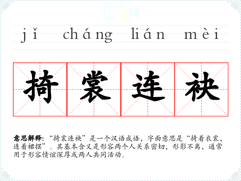 “掎裳连袂”是一个汉语成语,字面意思是“掎着衣裳,连着裙摆”。其基本含义是形容两个人关系密切,形影不离,通常用于形容情谊深厚或两人共同活动。