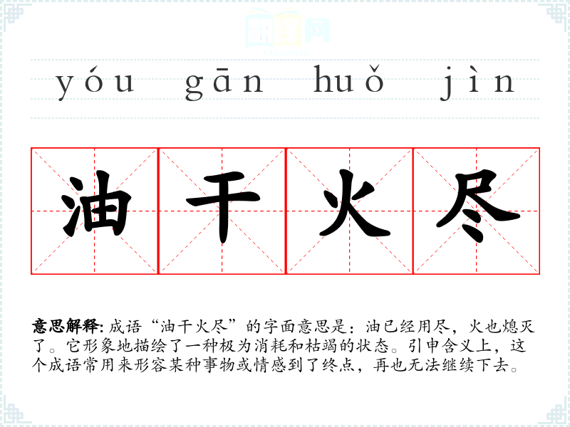 成语“油干火尽”的字面意思是:油已经用尽,火也熄灭了。它形象地描绘了一种极为消耗和枯竭的状态。引申含义上,这个成语常用来形容某种事物或情感到了终点,再也无法继续下去。