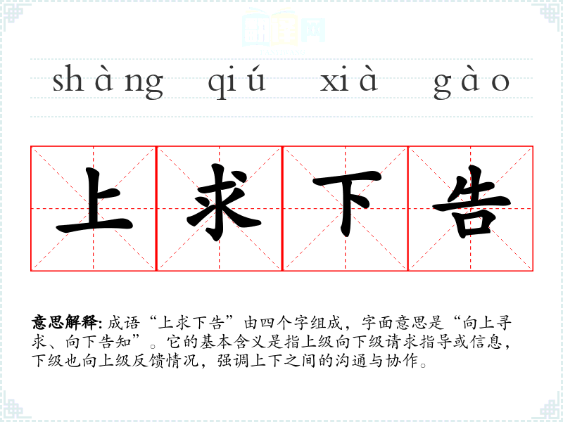 成语“上求下告”由四个字组成,字面意思是“向上寻求、向下告知”。它的基本含义是指上级向下级请求指导或信息,下级也向上级反馈情况,强调上下之间的沟通与协作。