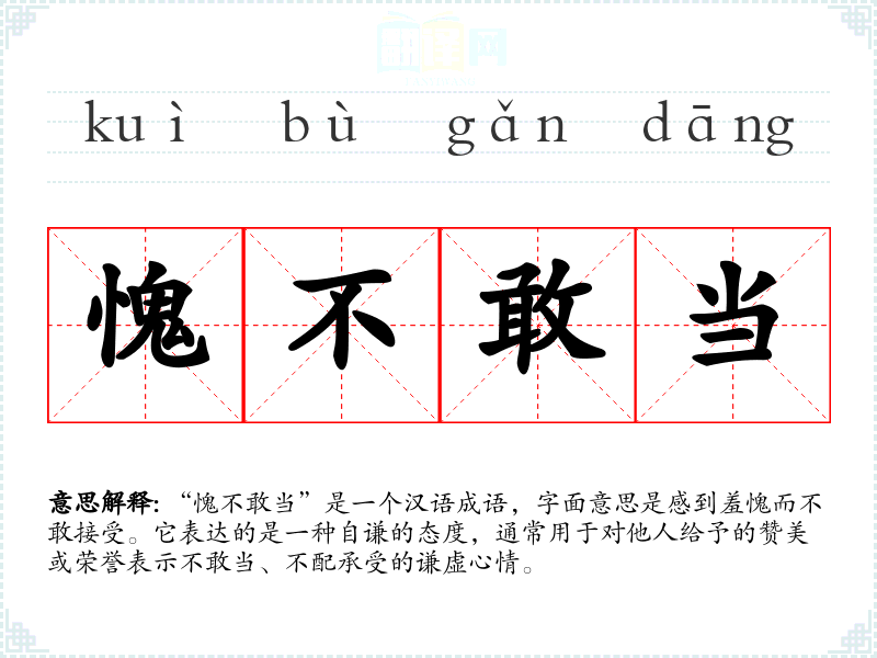 “愧不敢当”是一个汉语成语,字面意思是感到羞愧而不敢接受。它表达的是一种自谦的态度,通常用于对他人给予的赞美或荣誉表示不敢当、不配承受的谦虚心情。
