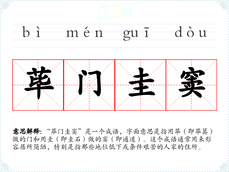 | 荜门圭窦 | 筚门:荆竹编成的门,又称柴门。常用以喻指贫户居室。 |