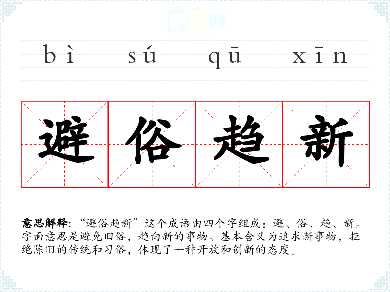 “避俗趋新”这个成语由四个字组成:避、俗、趋、新。字面意思是避免旧俗,趋向新的事物。基本含义为追求新事物,拒绝陈旧的传统和*俗,体现了一种开放和创新的态度。