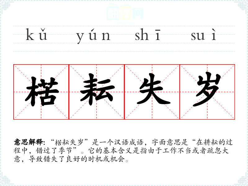 “楛耘失岁”是一个汉语成语,字面意思是“在耕耘的过程中,错过了季节”。它的基本含义是指由于工作不当或者疏忽大意,导致错失了良好的时机或机会。