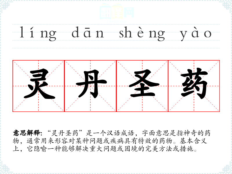 “灵丹圣药”是一个汉语成语,字面意思是指神奇的药物,通常用来形容对某种问题或疾病具有特效的药物。基本含义上,它隐喻一种能够解决重大问题或困境的完美方法或措施。