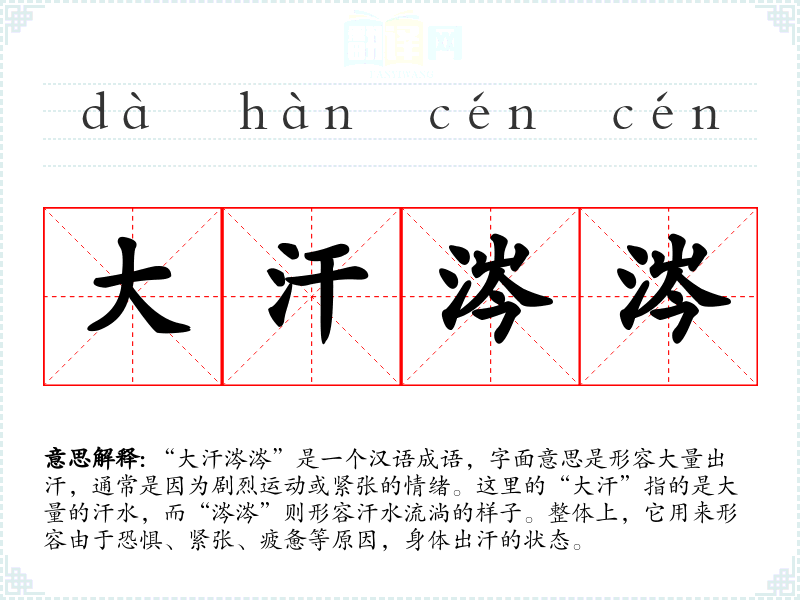在*传统文化中,出汗常常与身体的虚弱或心理的紧张相关联。因此,“大汗涔涔”不仅是身体反应的表现,也反映了人们在面对压力、挑战时的心理状态。在现代社会中,这个成语依然适用,特别是在职场、学等竞争激烈的场合。