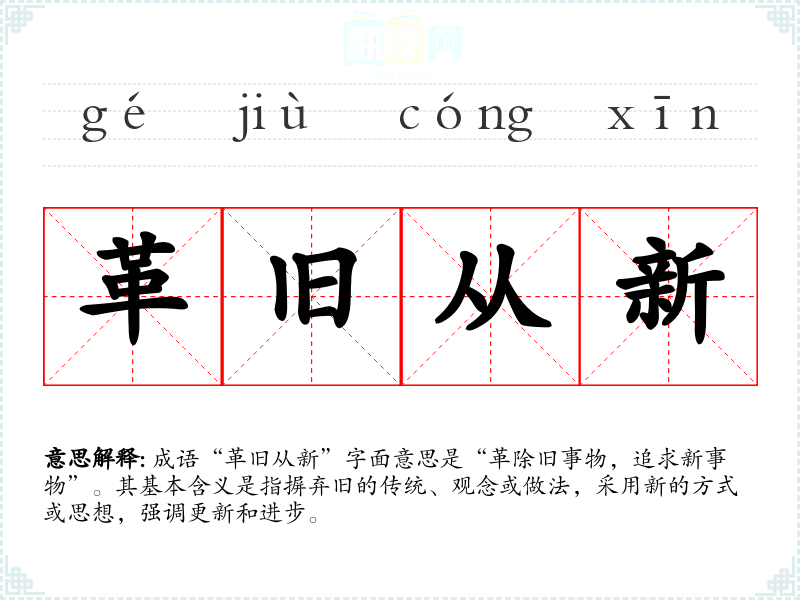 成语“革旧从新”字面意思是“革除旧事物,追求新事物”。其基本含义是指摒弃旧的传统、观念或做法,采用新的方式或思想,强调更新和进步。