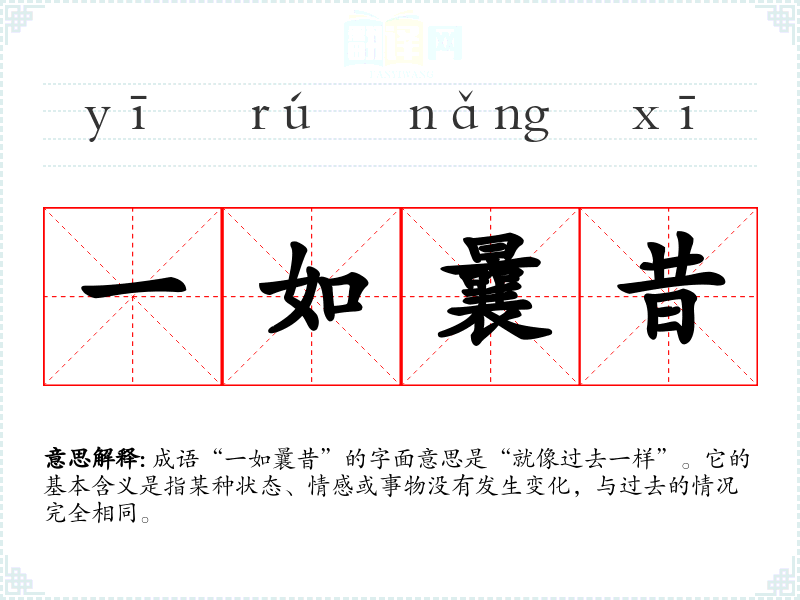 “一如曩昔”出自古汉语,包含“如”和“曩昔”两个部分。“如”意为“像、如同”,“曩昔”则指过去的时间。虽然没有明确的文学出处,但这个成语的使用可以追溯到古代文献中对时间和状态变化的描述。