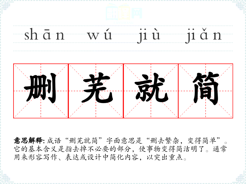 成语“删芜就简”字面意思是“删去繁杂,变得简单”。它的基本含义是指去掉不必要的部分,使事物变得简洁明了。通常用来形容写作、表达或设计中简化内容,以突出重点。
