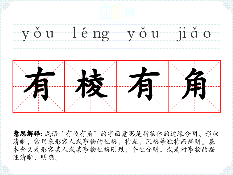 成语“有棱有角”的字面意思是指物体的边缘分明、形状清晰,常用来形容人或事物的性格、特点、风格等独特而鲜明。基本含义是形容某人或某事物性格刚烈、个性分明,或是对事物的描述清晰、明确。