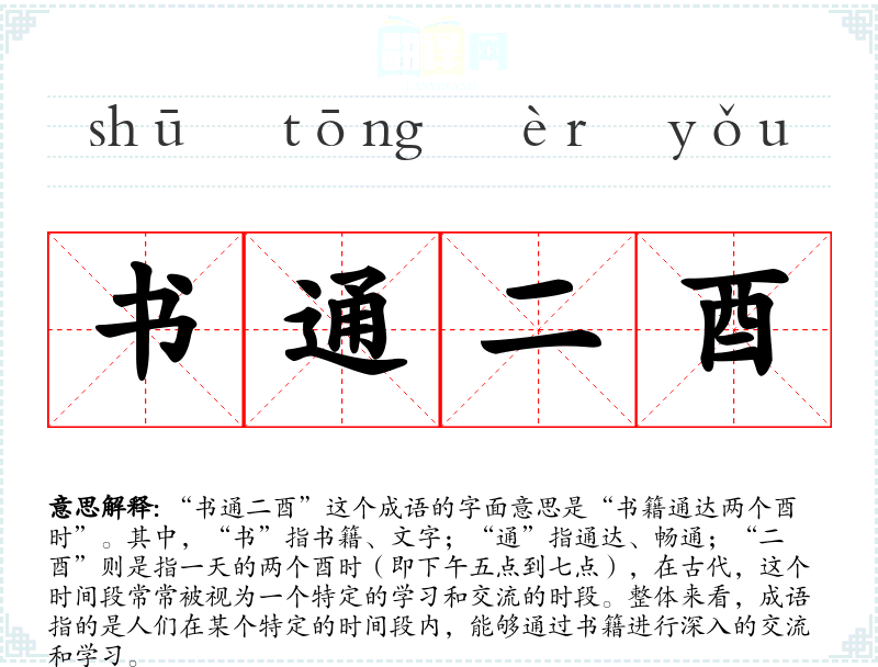 “书通二酉”这个成语的字面意思是“书籍通达两个酉时”。其中,“书”指书籍、文字;“通”指通达、畅通;“二酉”则是指一天的两个酉时(即下午五点到七点),在古代,这个时间段常常被视为一个特定的学和交流的时段。整体来看,成语指的是人们在某个特定的时间段内,能够通过书籍进行深入的交流和学。