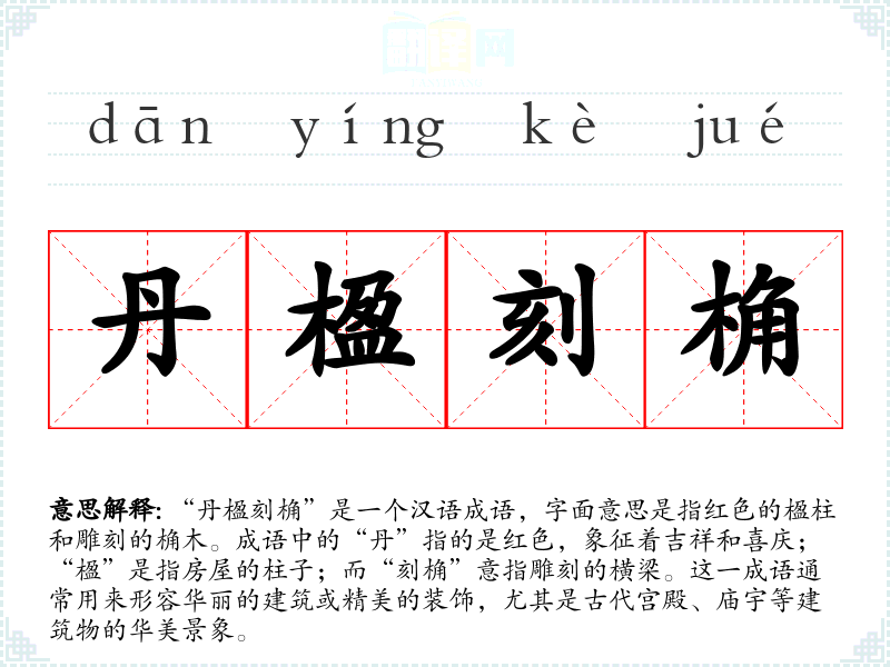 “丹楹刻桷”是一个汉语成语,字面意思是指红色的楹柱和雕刻的桷木。成语中的“丹”指的是红色,象征着吉祥和喜庆;“楹”是指房屋的柱子;而“刻桷”意指雕刻的横梁。这一成语通常用来形容华丽的建筑或精美的装饰,尤其是古代宫殿、庙宇等建筑物的华美景象。