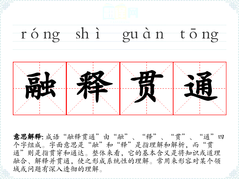 成语“融释贯通”由“融”、“释”、“贯”、“通”四个字组成。字面意思是“融”和“释”是指理解和解析,而“贯通”则是指贯穿和通达。整体来看,它的基本含义是将知识或道理融合、解释并贯通,使之形成系统性的理解。常用来形容对某个领域或问题有深入透彻的理解。