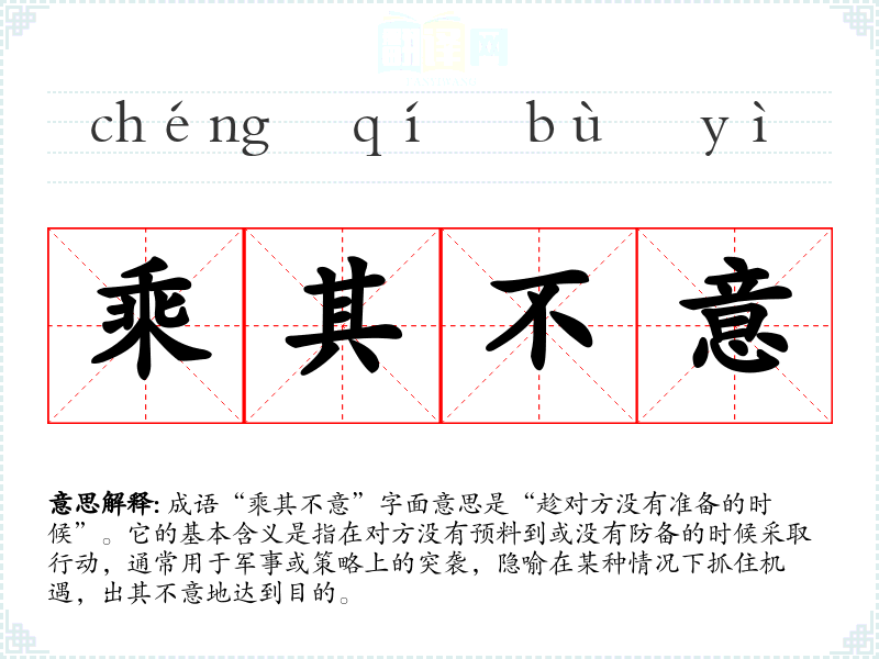 在英语中,有类似的表达“take someone by surprise”,同样强调在未被预料的情况下采取行动。然而,中文的“乘其不意”更具战略性和深厚的文化背景,强调的是主动出击的智慧。