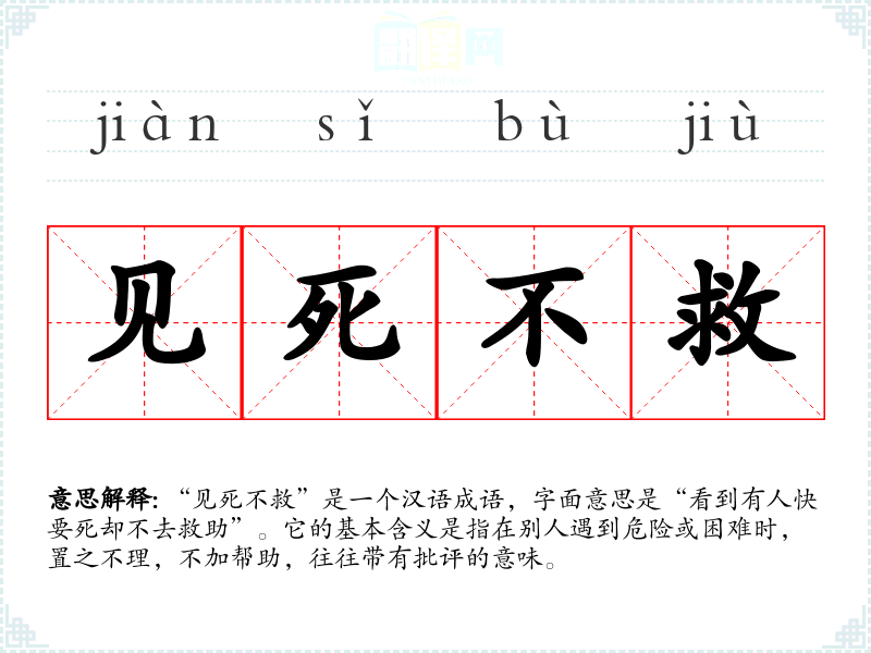 “见死不救”是一个汉语成语,字面意思是“看到有人快要死却不去救助”。它的基本含义是指在别人遇到危险或困难时,置之不理,不加帮助,往往带有批评的意味。
