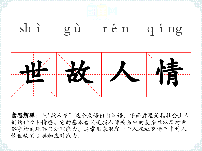 “世故人情”这个成语出自汉语,字面意思是指社会上人们的世故和情感。它的基本含义是指人际关系中的复杂性以及对世俗事物的理解与处理能力。通常用来形容一个人在社交场合中对人情世故的了解和应对能力。