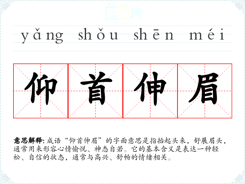 成语“仰首伸眉”的字面意思是指抬起头来,舒展眉头,通常用来形容心情愉悦、神态自若。它的基本含义是表达一种轻松、自信的状态,通常与高兴、舒畅的情绪相关。