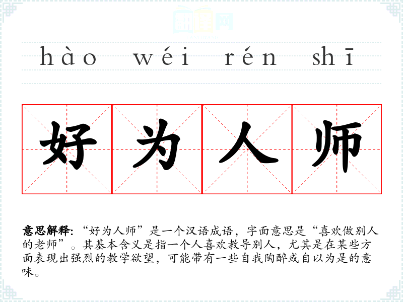 “好为人师”是一个汉语成语,字面意思是“喜欢做别人的老师”。其基本含义是指一个人喜欢教导别人,尤其是在某些方面表现出强烈的教学欲望,可能带有一些自我陶醉或自以为是的意味。