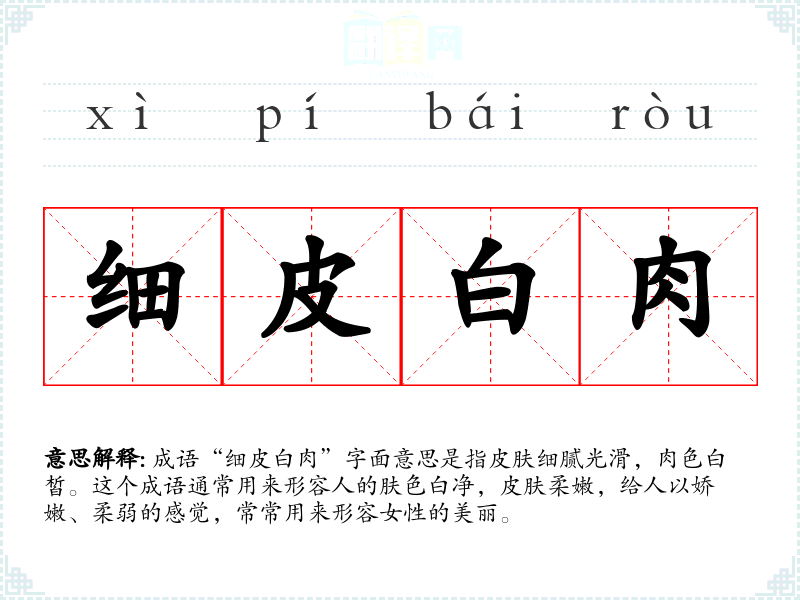 成语“细皮白肉”字面意思是指皮肤细腻光滑,肉色白皙。这个成语通常用来形容人的肤色白净,皮肤柔嫩,给人以娇嫩、柔弱的感觉,常常用来形容女性的美丽。
