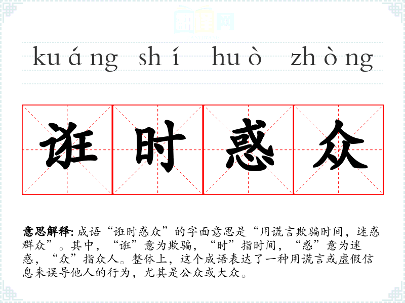 成语“诳时惑众”的字面意思是“用谎言欺骗时间,迷惑群众”。其中,“诳”意为欺骗,“时”指时间,“惑”意为迷惑,“众”指众人。整体上,这个成语表达了一种用谎言或虚假信息来误导他人的行为,尤其是公众或大众。