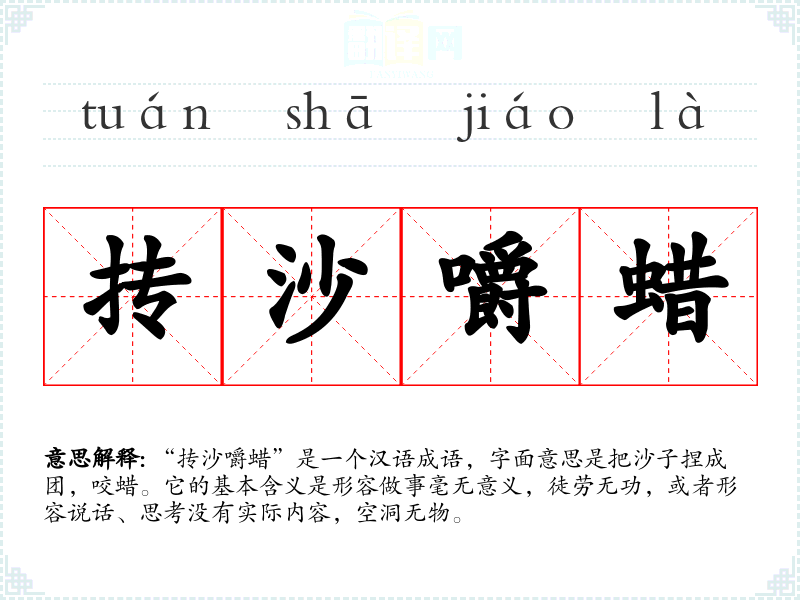 “抟沙嚼蜡”是一个汉语成语,字面意思是把沙子捏成团,咬蜡。它的基本含义是形容做事毫无意义,徒劳无功,或者形容说话、思考没有实际内容,空洞无物。