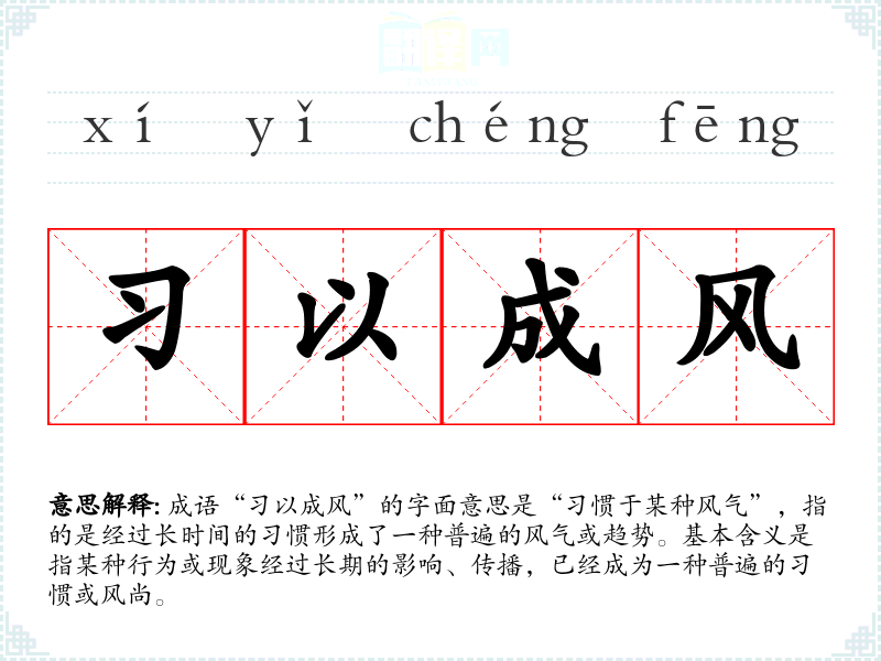 成语“以成风”的字面意思是“惯于某种风气”,指的是经过长时间的惯形成了一种普遍的风气或趋势。基本含义是指某种行为或现象经过长期的影响、传播,已经成为一种普遍的惯或风尚。