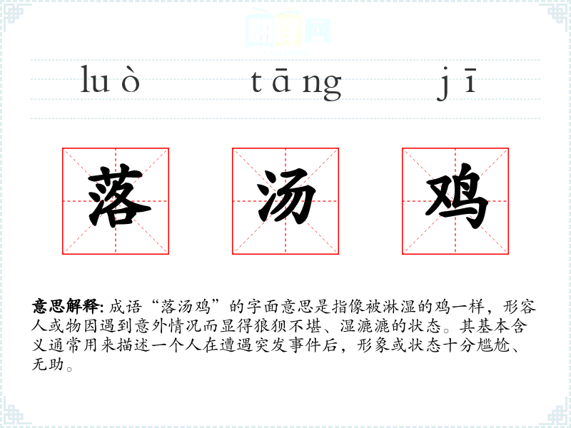 成语“落汤鸡”的字面意思是指像被淋湿的鸡一样,形容人或物因遇到意外情况而显得狼狈不堪、湿漉漉的状态。其基本含义通常用来描述一个人在遭遇突发**后,形象或状态十分尴尬、无助。