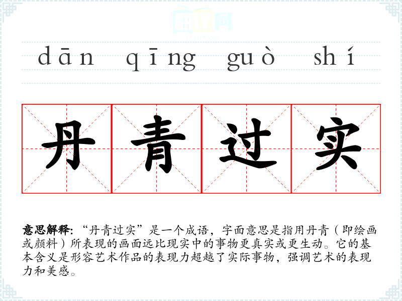 “丹青过实”是一个成语,字面意思是指用丹青(即绘画或颜料)所表现的画面远比现实中的事物更真实或更生动。它的基本含义是形容艺术作品的表现力超越了实际事物,强调艺术的表现力和美感。