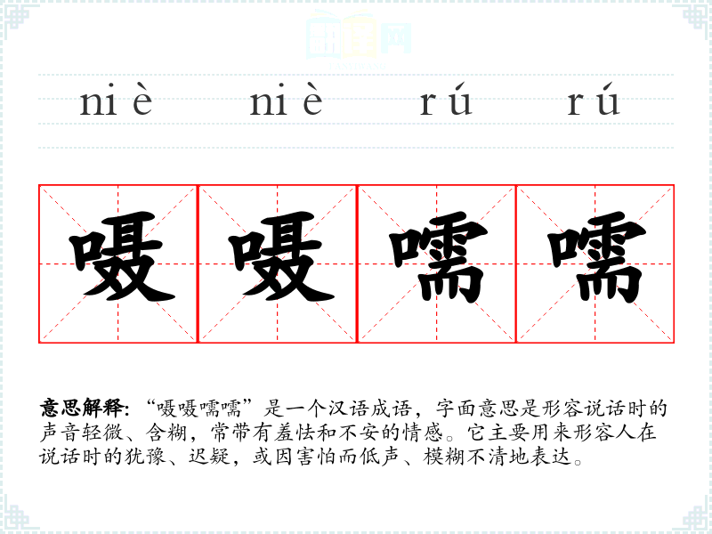 “嗫嗫嚅嚅”是一个汉语成语,字面意思是形容说话时的声音轻微、含糊,常带有羞怯和不安的情感。它主要用来形容人在说话时的犹豫、迟疑,或因害怕而低声、模糊不清地表达。