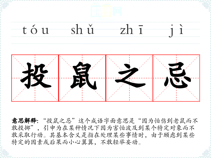 “投鼠之忌”这个成语字面意思是“因为怕伤到老鼠而不敢投掷”,引申为在某种情况下因为害怕波及到某个特定对象而不敢采取行动。其基本含义是指在处理某些事情时,由于顾虑到某些特定的因素或后果而小心翼翼,不敢轻举妄动。