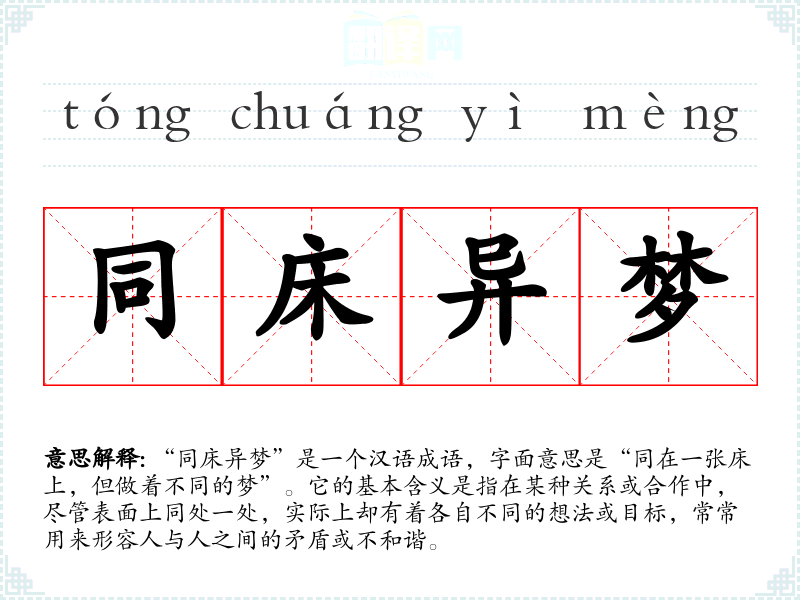 “同床异梦”是一个汉语成语,字面意思是“同在一张床上,但做着不同的梦”。它的基本含义是指在某种关系或合作中,尽管表面上同处一处,实际上却有着各自不同的想法或目标,常常用来形容人与人之间的矛盾或不和谐。
