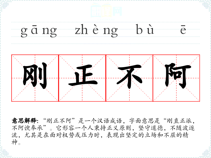 “刚正不阿”是一个汉语成语,字面意思是“刚直正派,不阿谀奉承”。它形容一个人秉持正义原则,坚守道德,不随波逐流,尤其是在面对权势或压力时,表现出坚定的立场和不屈的精神。