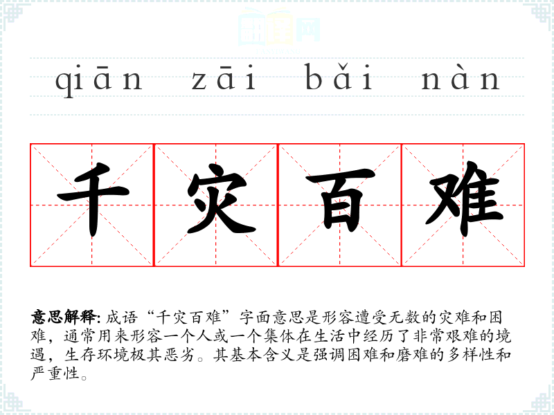 “千灾百难”源于古代汉语,虽然不能确定确切的出处,但其构成中的“千”和“百”均表示数量的庞大,而“灾”和“难”则指代各种不幸和困扰。类似的成语在古代文献中时常出现,用以反映人们在生活中所遭遇的苦难。