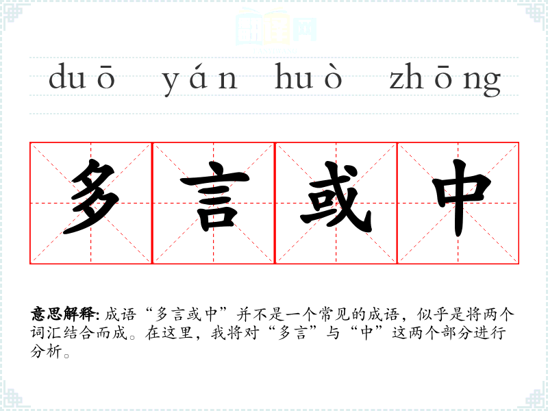 成语“多言或中”并不是一个常见的成语,似乎是将两个词汇结合而成。在这里,我将对“多言”与“中”这两个部分进行分析。
