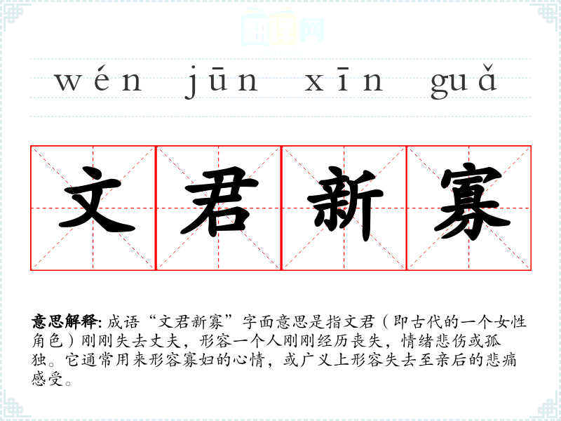 成语“文君新寡”字面意思是指文君(即古代的一个女性角色)刚刚失去丈夫,形容一个人刚刚经历丧失,情绪悲伤或孤独。它通常用来形容寡妇的心情,或广义上形容失去至亲后的悲痛感受。