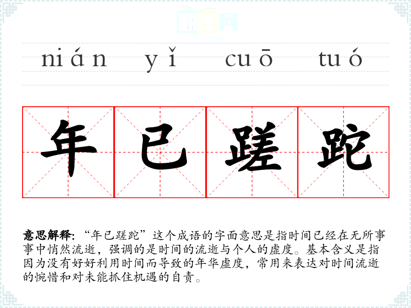 “年已蹉跎”这个成语的字面意思是指时间已经在无所事事中悄然流逝,强调的是时间的流逝与个人的虚度。基本含义是指因为没有好好利用时间而导致的年华虚度,常用来表达对时间流逝的惋惜和对未能抓住机遇的自责。
