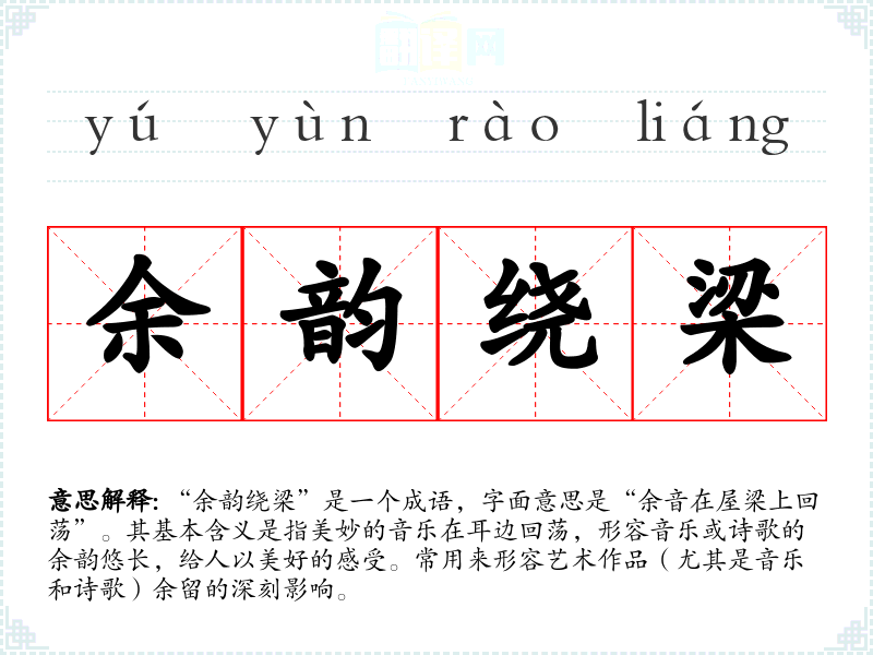 该成语源于古代文学,最早见于《离骚》的注释中。它反映了古人对音乐和诗歌的深刻理解与情感。成语中提到的“梁”,指的是屋檐或房顶的结构,象征着空间与时间的延续,表达了艺术作品在听众心中留下的深远印象。