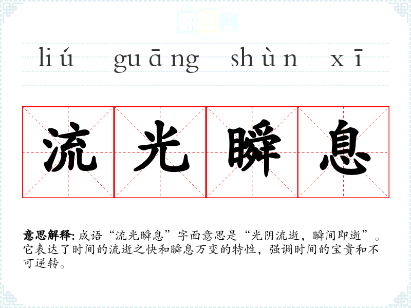 “流光瞬息”出自于古代文学,通常用来形容时间的迅速流逝。尽管没有确切的典故来源,这一成语的构成词“流光”和“瞬息”都具有各自的文学背景,流光常用来形容光阴的流逝,而瞬息则强调瞬间和变化,二者结合体现了时间的无情和紧迫。