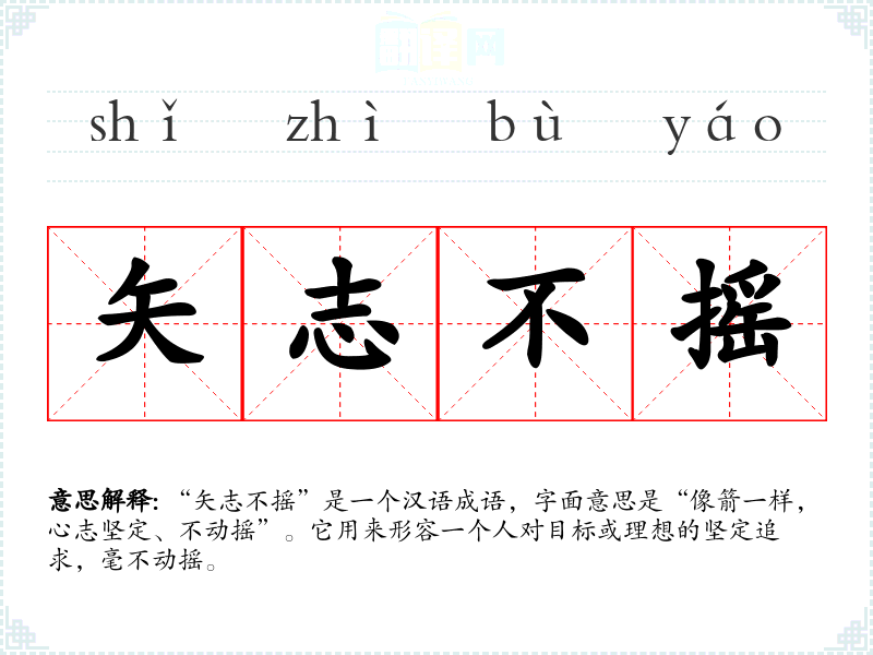 “矢志不摇”是一个汉语成语,字面意思是“像箭一样,心志坚定、不动摇”。它用来形容一个人对目标或理想的坚定追求,毫不动摇。