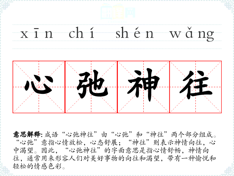 成语“心弛神往”由“心弛”和“神往”两个部分组成。“心弛”意指心情放松,心态舒展;“神往”则表示神情向往,心中渴望。因此,“心弛神往”的字面意思是指心情舒畅,神情向往,通常用来形容人们对美好事物的向往和渴望,带有一种愉悦和轻松的情感色彩。