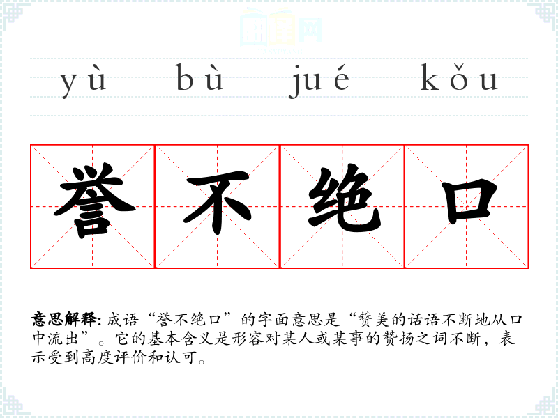 成语“誉不绝口”的字面意思是“赞美的话语不断地从口中流出”。它的基本含义是形容对某人或某事的赞扬之词不断,表示受到高度评价和认可。