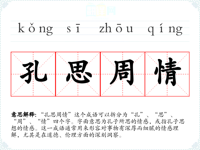“孔思周情”这个成语可以拆分为“孔”、“思”、“周”、“情”四个字。字面意思为孔子所思的情感,或指孔子思想的情感。这一成语通常用来形容对事物有深厚而细腻的情感理解,尤其是在道德、伦理方面的深刻洞察。