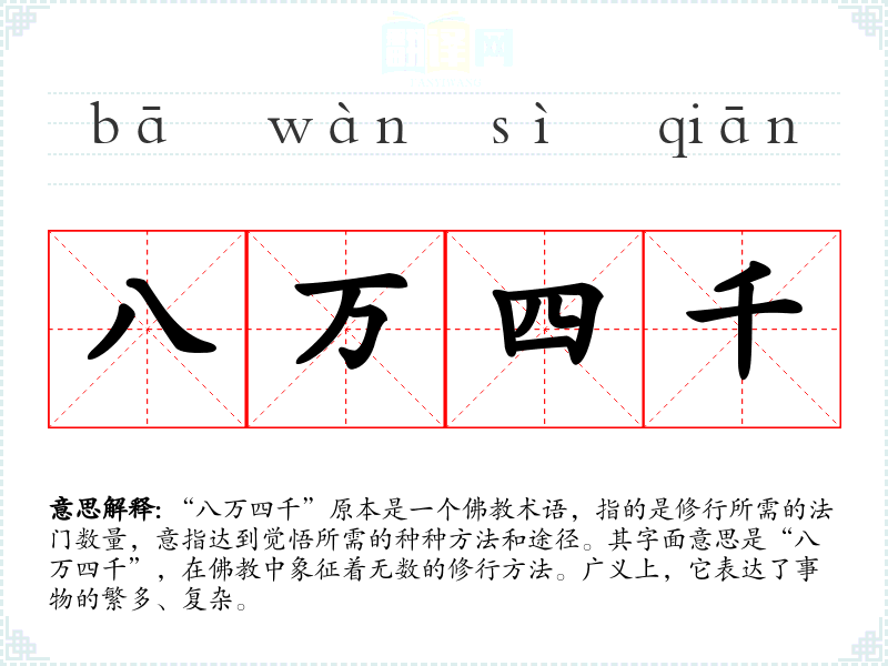 “八万四千”原本是一个术语,指的是修行所需的法门数量,意指达到觉悟所需的种种方法和途径。其字面意思是“八万四千”,在中象征着无数的修行方法。广义上,它表达了事物的繁多、复杂。