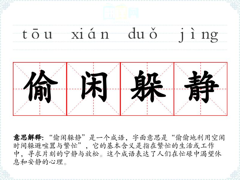 “偷闲躲静”是一个成语,字面意思是“偷偷地利用空闲时间躲避喧嚣与繁忙”,它的基本含义是指在繁忙的生活或工作中,寻求片刻的宁静与放松。这个成语表达了人们在忙碌中渴望休息和安静的心理。