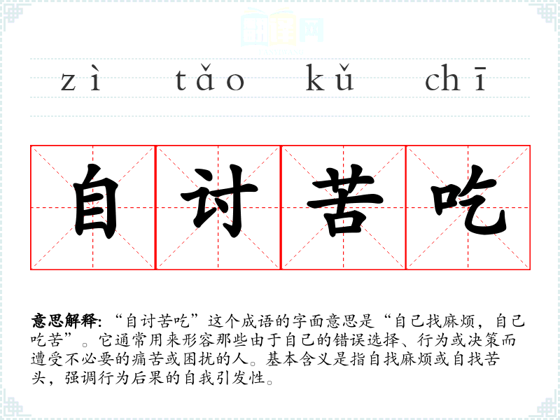 “自讨苦吃”这个成语的字面意思是“自己找麻烦,自己吃苦”。它通常用来形容那些由于自己的错误选择、行为或决策而遭受不必要的痛苦或困扰的人。基本含义是指自找麻烦或自找苦头,强调行为后果的自我引发性。