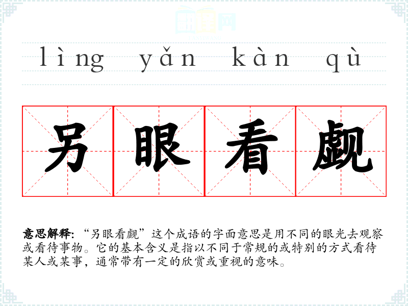 “另眼看觑”这个成语的字面意思是用不同的眼光去观察或看待事物。它的基本含义是指以不同于常规的或特别的方式看待某人或某事,通常带有一定的欣赏或重视的意味。